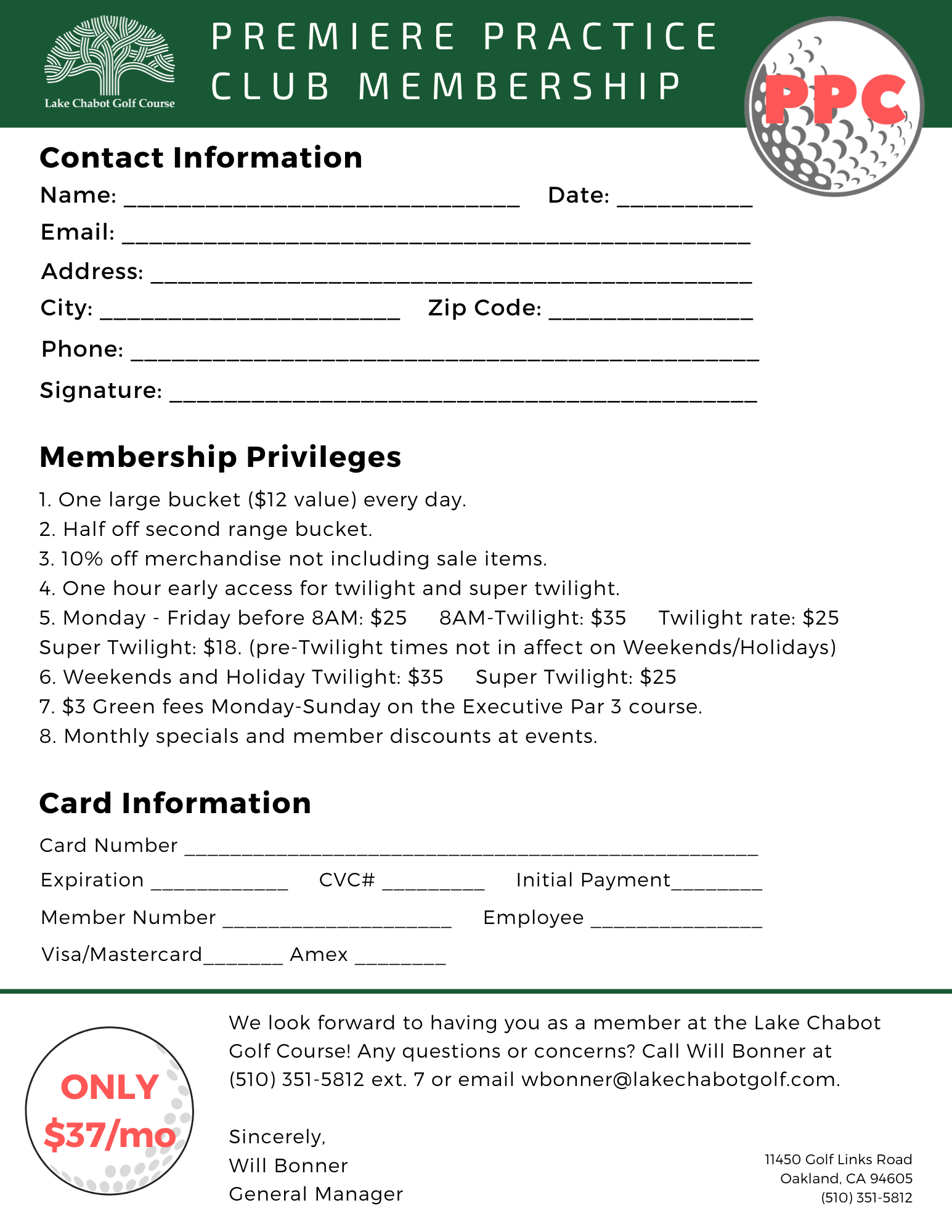Whether you are seeking a beautiful view of the Bay Area, golf with family and friends, a unique setting for entertaining clients or a warm and welcoming ambience for socializing with others who share your passion for the game, Lake Chabot Golf Course offers a golf membership that has many benefits under budget. The Premeire Practice Club Membership is our top membership at Lake Chabot Golf Course.